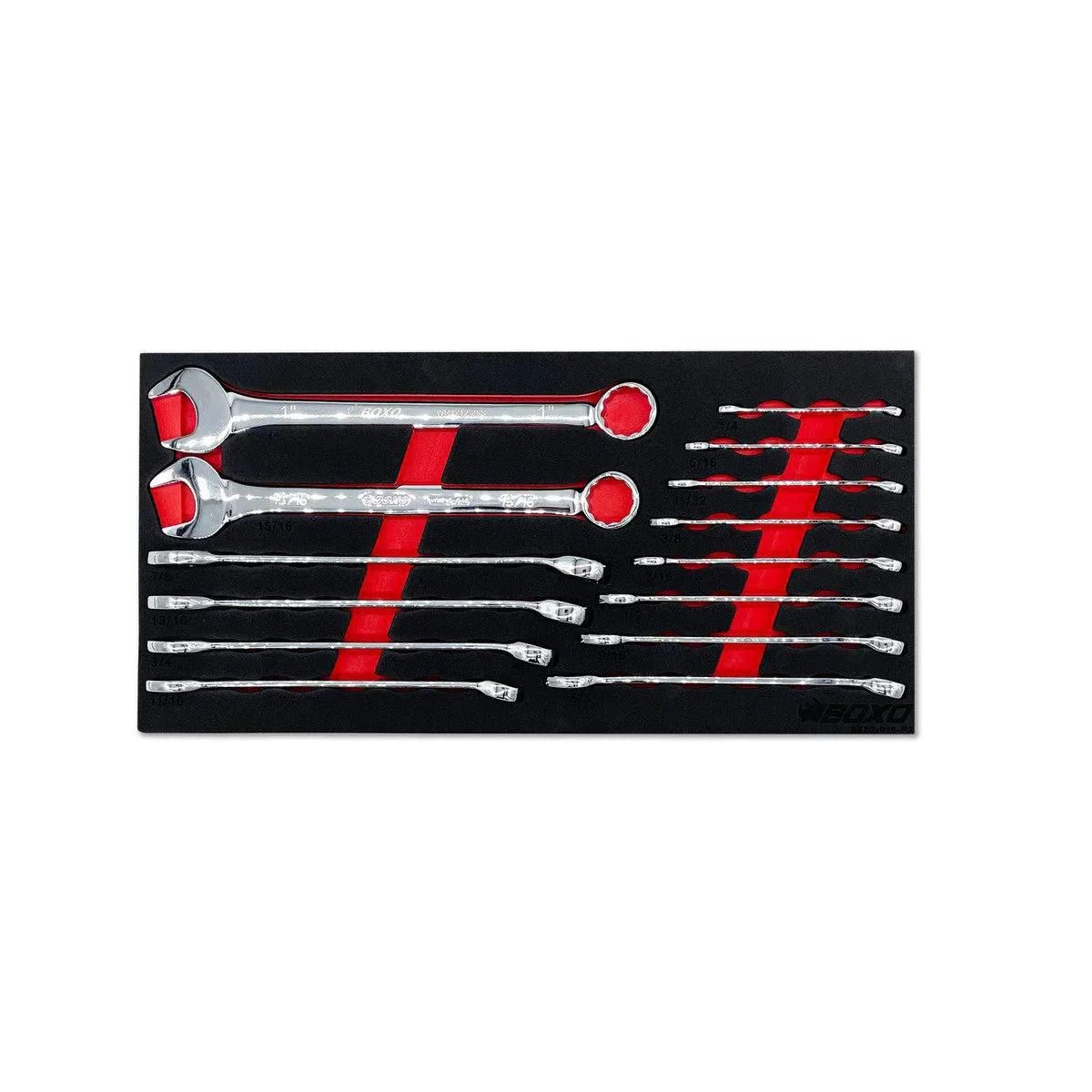 Each BOXOusa tool set supplied with our EVA foam tool storage solution is carefully arranged and engineered to maximize space for optimal tool organization. Every BOXO tool set housed in EVA foam fits precisely into our toolboxes or tool cabinets, keeping tools organized and preventing movement during transportation. All tools are digitally scanned using a CAD system, and a computer-controlled routing machine cuts each cavity to the exact tool shape to maximize space efficiency. The dual-color red and black EVA foam provides clear visual contrast, allowing for quick inspection and easy return of tools to their proper locations.