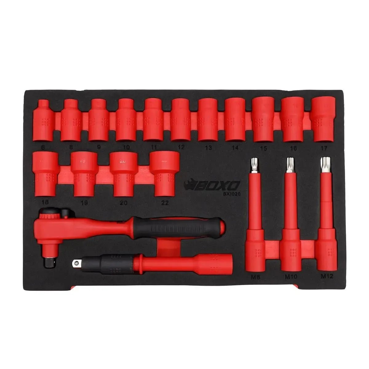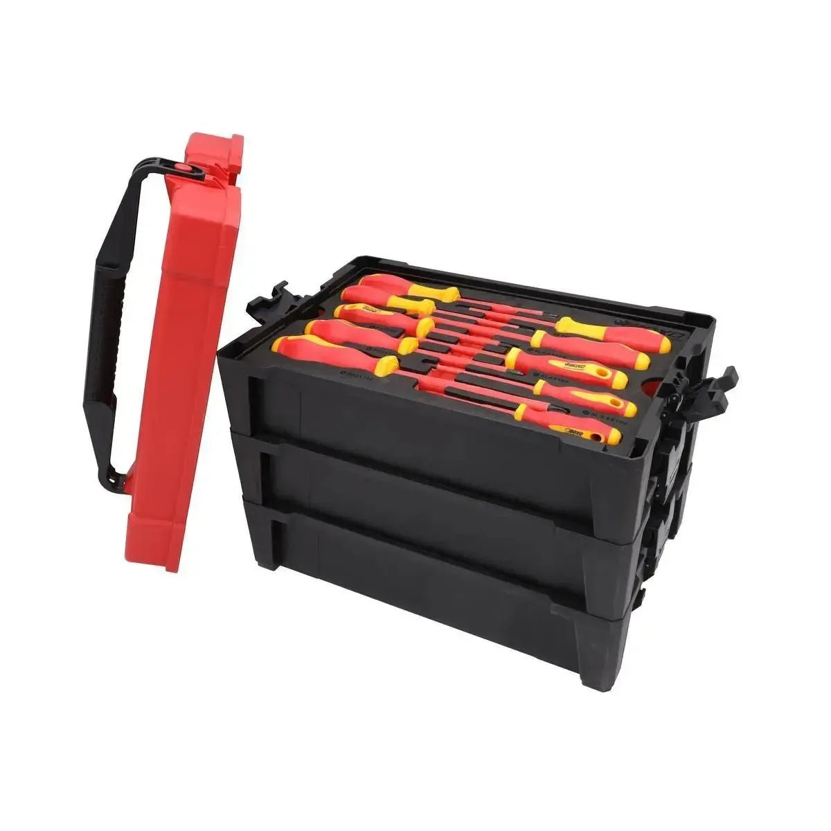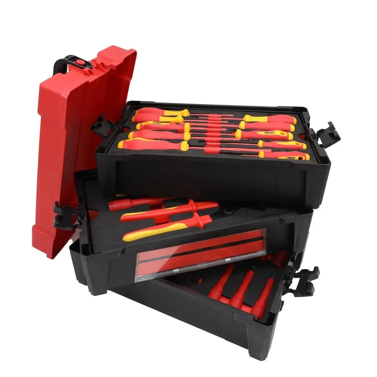 The set is organized in BoxoUSA signature EVA foam inserts that securely hold each tool in place. These inserts fit into three heavy-duty interlocking plastic compartments with snap-shut latches and a carry handle, creating a convenient and portable tool kit.