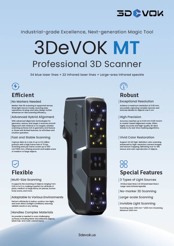 The 3DeVOK MT is a professional-grade precision 3D scanner built for demanding work. It has an infrared and blue light mode. This scanner provides professionals across diverse industries with powerful tools to digitize real-world objects.