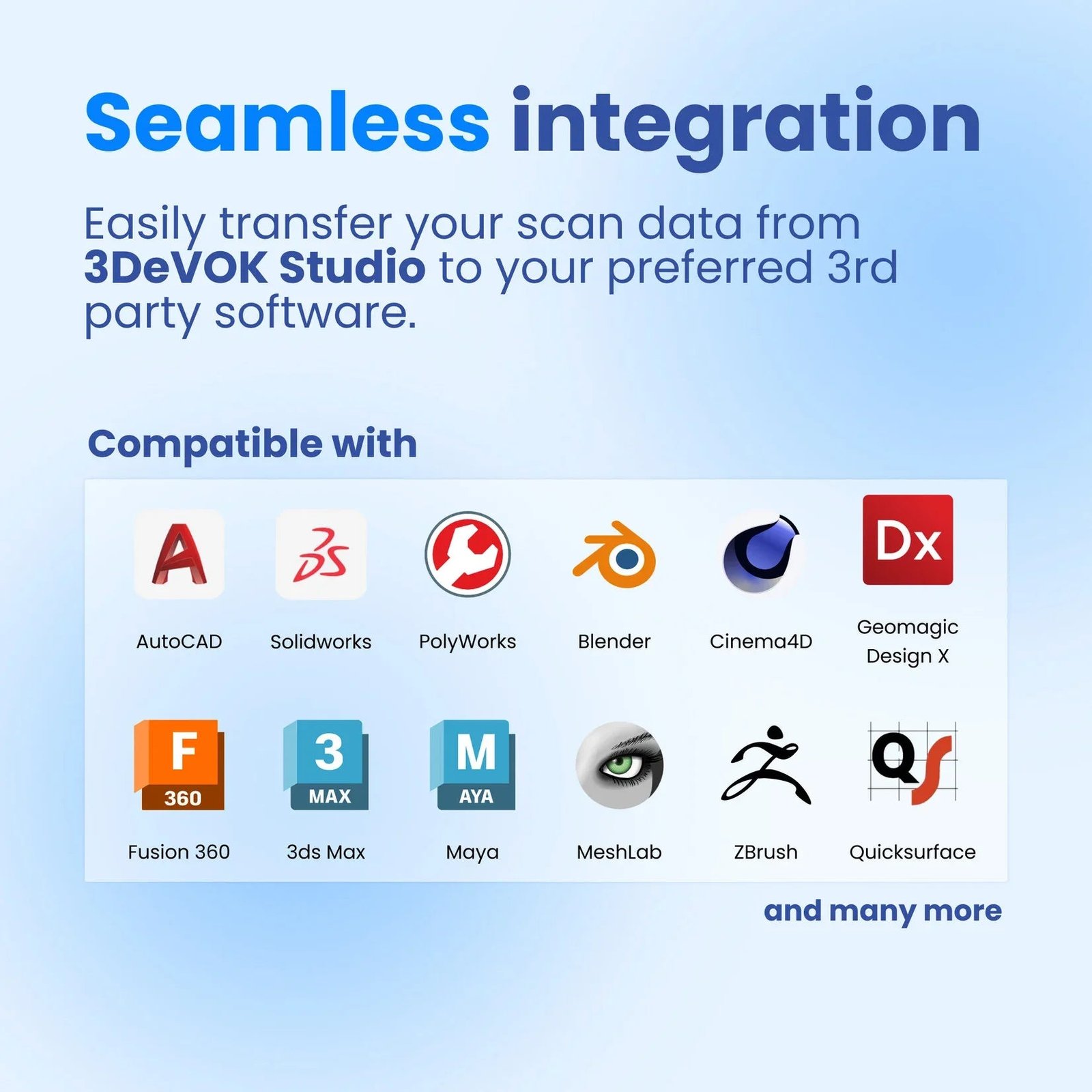 The 3DeVOK MT scanner comes bundled with 3DeVOK Studio, our professional-grade 3D scanning software. The software includes real-time point cloud generation, hybrid alignment (texture and geometry), localized high-resolution scanning, and more. No subscriptions, no extra licenses, everything is included. After capturing the 3D scan data in 3DeVOK Studio, you can easily transfer it to your preferred 3rd party software.