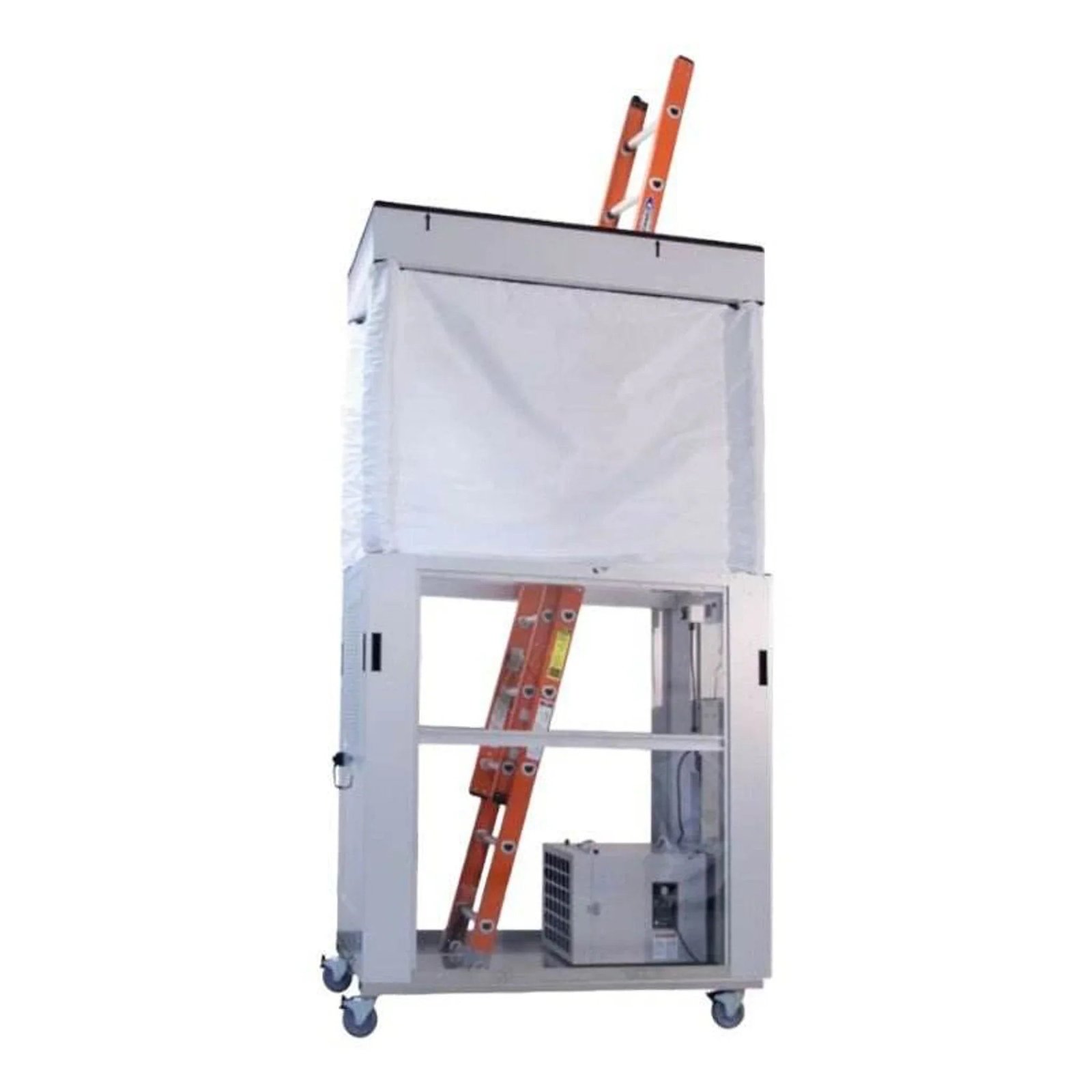 - AG8000 cart: 900 lb capacity, 10’2″ ceiling reach — hand-crank height adjustment with one operator; 16-ft fiberglass ladder included; CPAI-84 flame-retardant sleeve seals the ceiling opening.