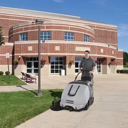 This battery walk-behind sweeper is for both indoor and outdoor use and delivers superior industrial cleaning from a rugged, durable, economical and easy-to-use design. All controls can be accessed from the operator’s position, with an ergonomic handlebar and propulsion control bar that provide comfortable, single-hand operation. Simple controls and security are provided via key switch, and single-hand hopper removal and transfer make debris handling quick and efficient. Fast and effective sweeping comes from a direct throw design with side broom options and independent side broom controls on the handle. A simple, standard manual filter shaker keeps filters performing longer, and tools-free service of all routine maintenance items reduces downtime. The sweeper is powered by a 0.9 hp main motor and ships with two batteries and an on-board charger — available in maintenance-free or wet battery options — providing run time up to 3 hours on a single charge. Durable construction, easy servicing, and intuitive operator controls make this walk-behind sweeper an efficient choice for commercial and industrial floor care.