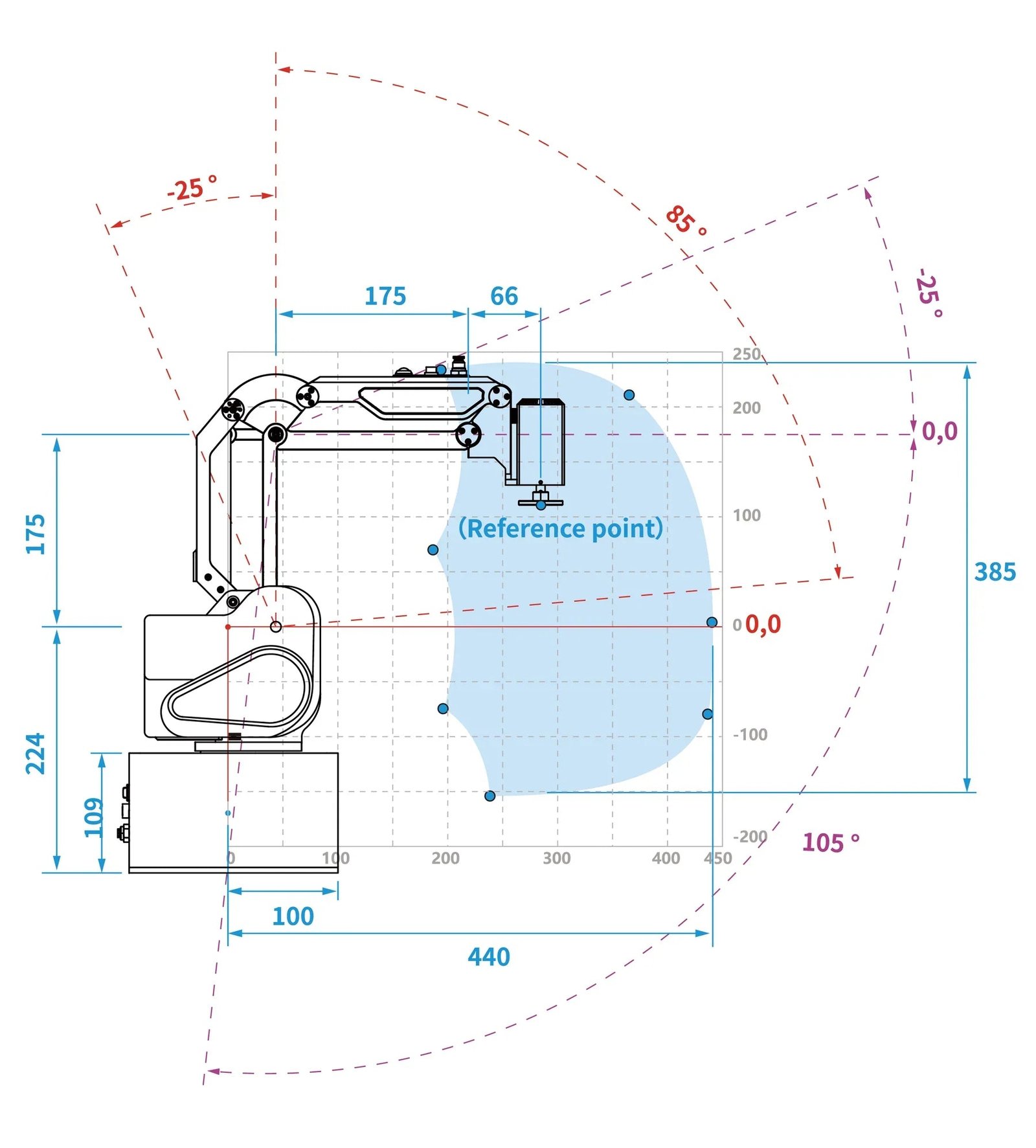 | Joint Ranges | J1: ±160°, J2: -25° ~ 85°, J3: -25° ~ 105°, J4: -180° ~ 180° |