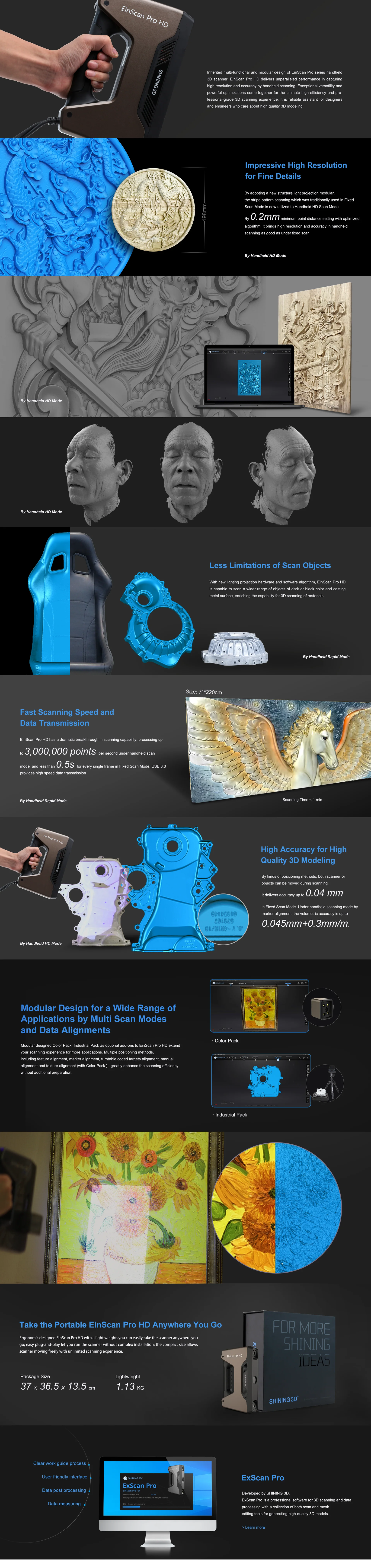 The EinScan Pro HD inherited the multi-functional and modular design of the EinScan Pro series handheld 3D scanner. The 3D scanner delivers unparalleled performance in capturing high resolution and accuracy by handheld scanning. Exceptional versatility and powerful optimizations come together for the ultimate high-efficiency and professional-grade 3D scanning experience. It is a reliable assistant for designers and engineers who care about high quality 3D modeling.