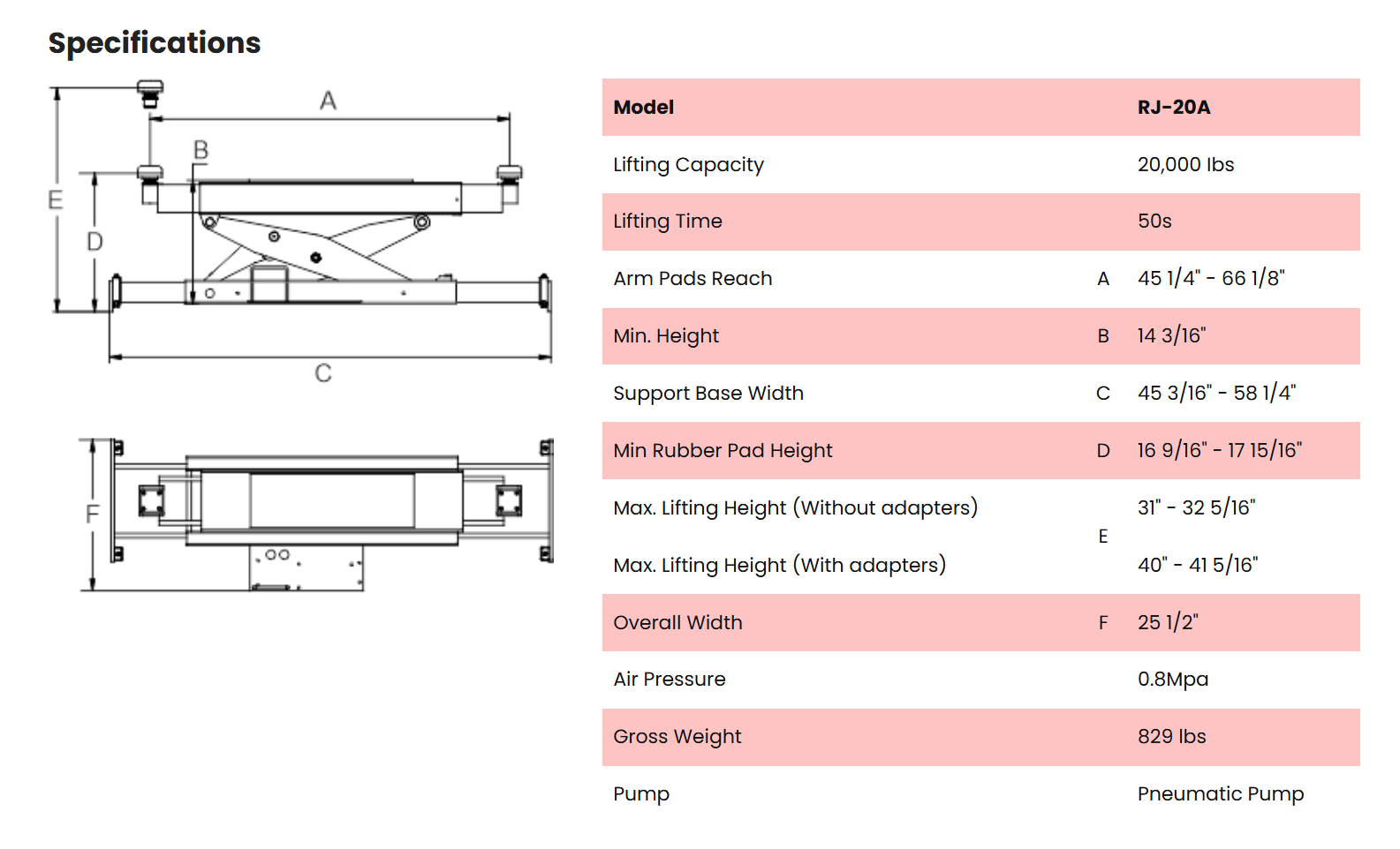 The AMGO RJ-20A, engineered for extreme heavy-duty lifting, offers an impressive 20,000 lbs capacity. Built with a reinforced heavy-duty structure, it comes standard with a saddle adapter for enhanced versatility. Undeniably, the RJ-20A stands as one of the most powerful rolling jacks available in the industry.