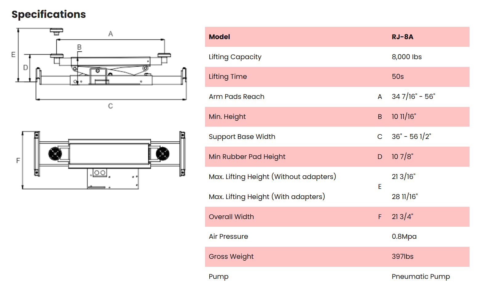 The AMGO RJ-8A is a commercial-grade powerhouse designed for effortless operation and exceptional durability. Built with a strengthened structure and equipped with AMGO’s advanced floating rolling technology, it boasts an impressive lifting capacity of 8,000 lbs. The telescoping arms and adjustable lower sliding assembly allow for versatile application across a variety of vehicles, making it an indispensable lifting tool for both commercial shops and home garages. Let me know if there’s anything else you’d like adjusted!