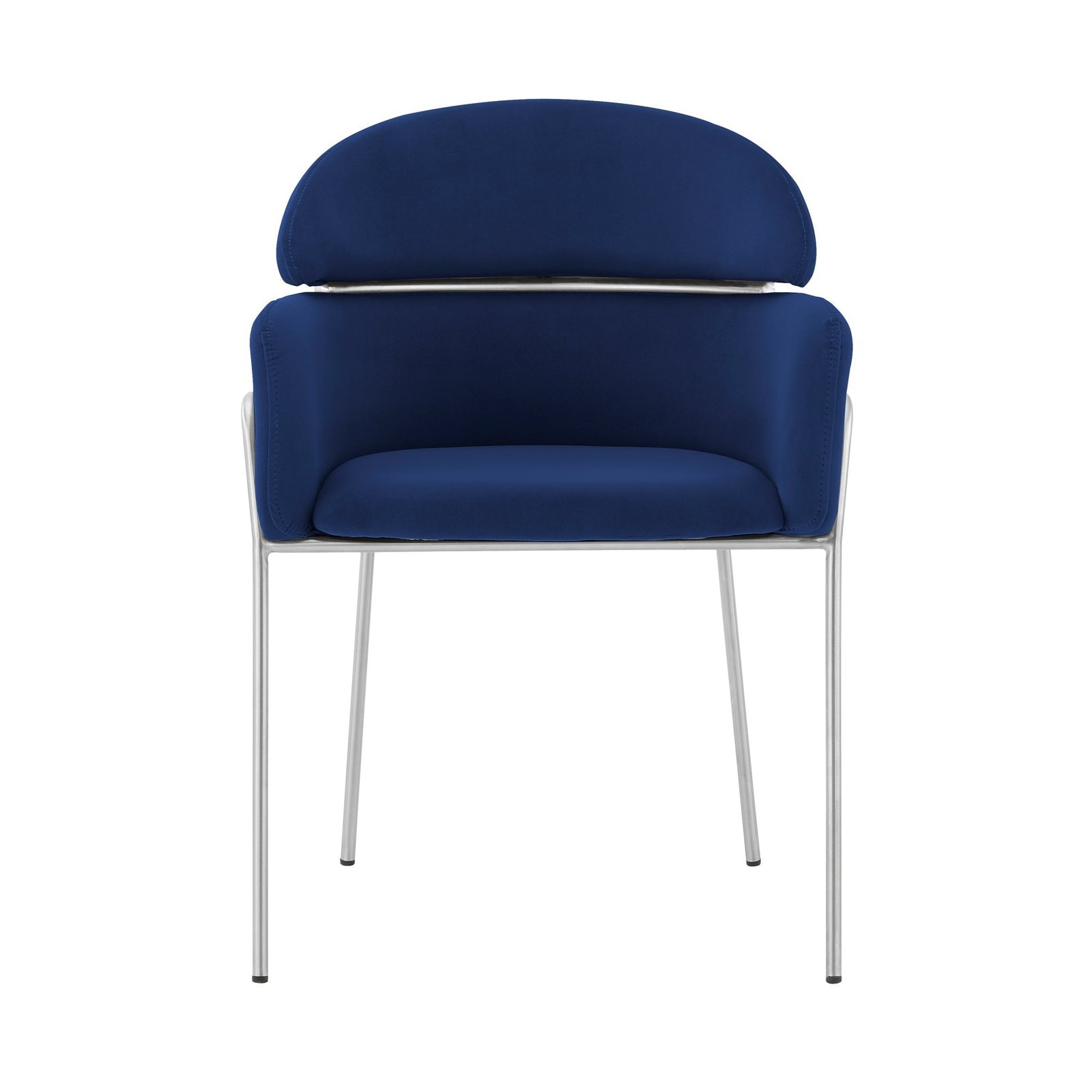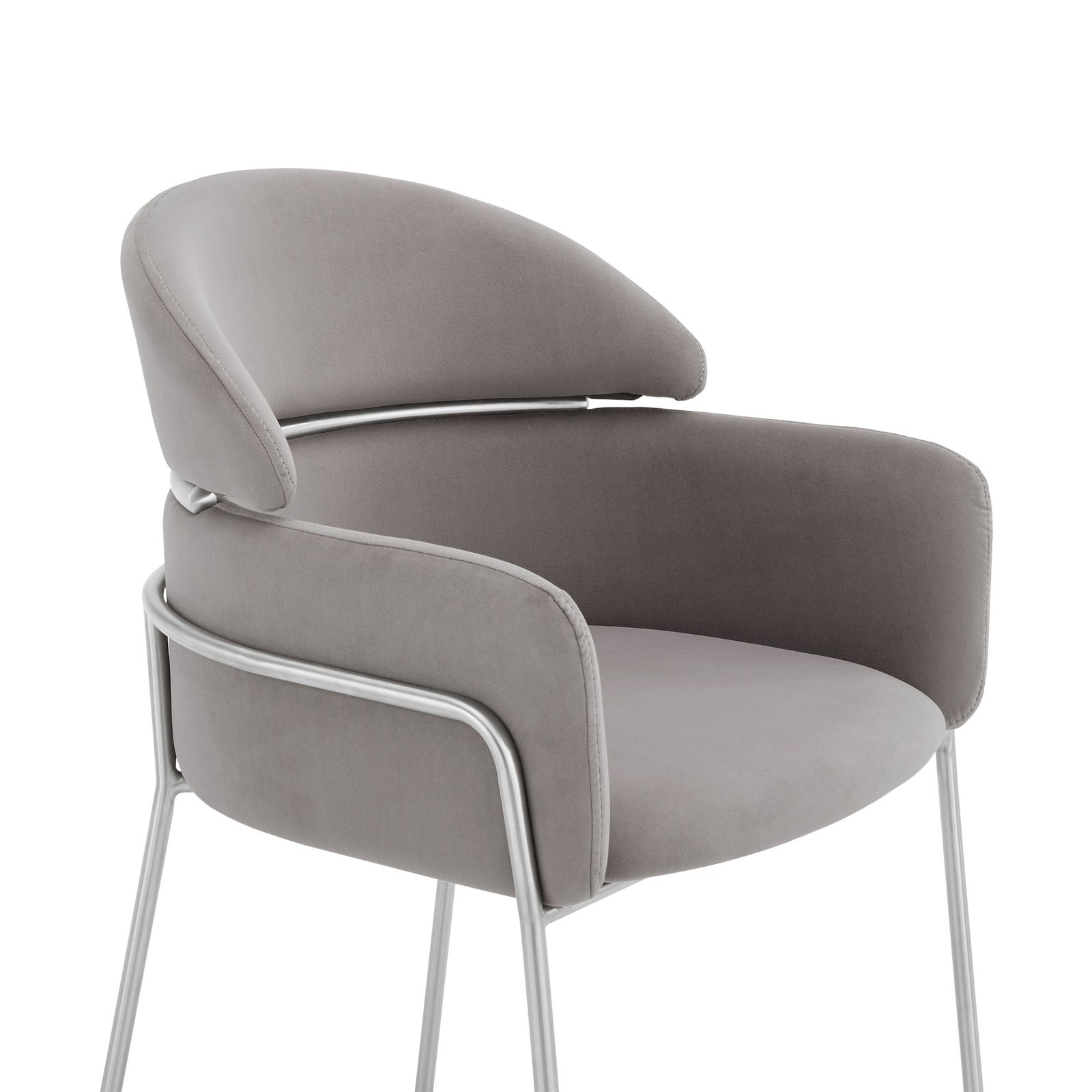 The Cressida and Portia 5-Piece Dining Set from Armen Living is thoughtfully designed to elevate the comfort and style of your home. The Portia Dining Chair features a wide seat, high back, and supportive arms that provide stability and security while seating. Its plush foam-padded cushion ensures optimal comfort for extended use. The stainless steel frame adds both a modern aesthetic and lasting durability. Choose from Gray or Blue fabric options to match your decor.