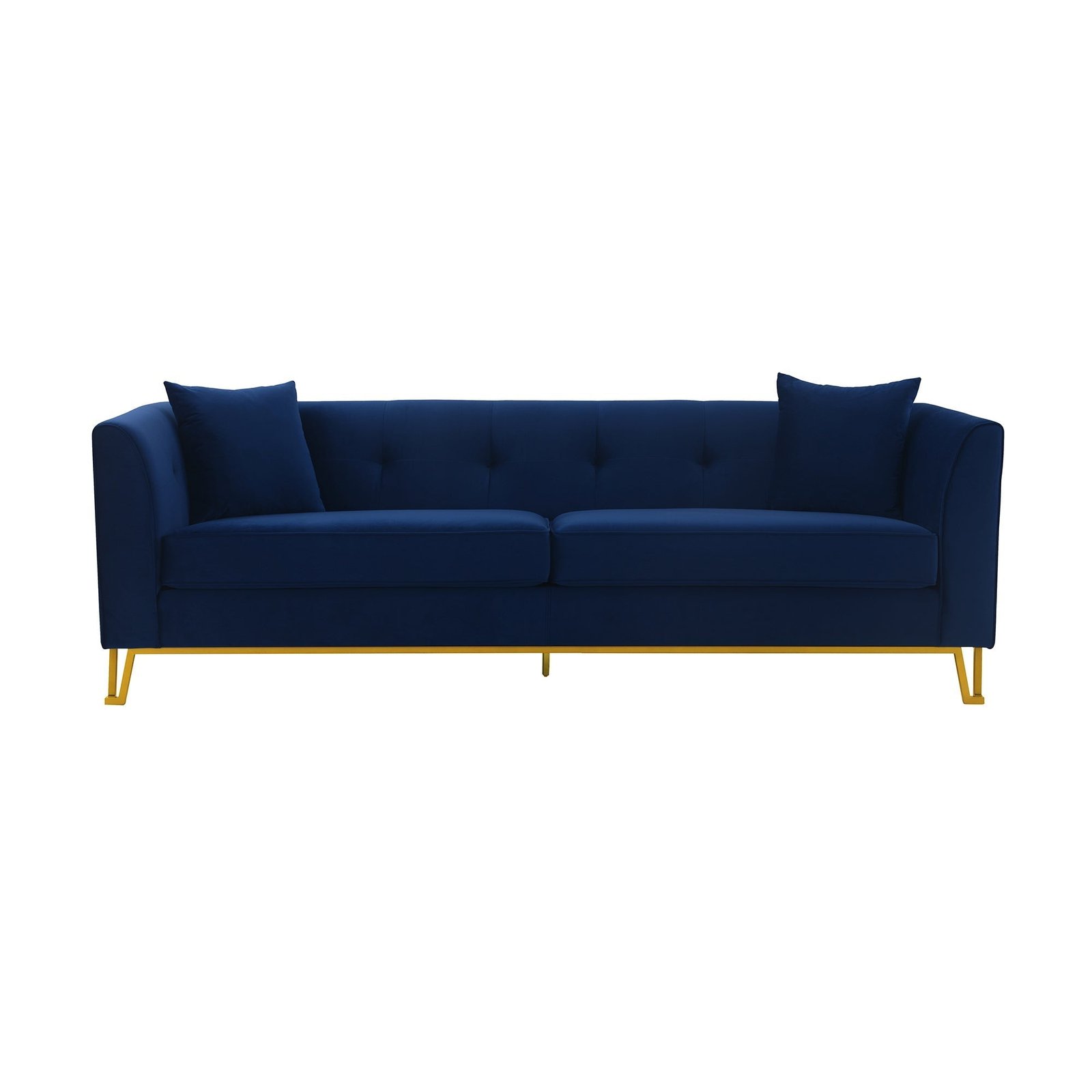 Its elegant brushed gold legs complement the fabric upholstery, adding a touch of sophistication and uniqueness. The sofa also includes two stylish toss pillows for added flair. The Everest Sofa is available in Blue, Gray, and Blush fabric, allowing you to choose the color that best suits your space.
