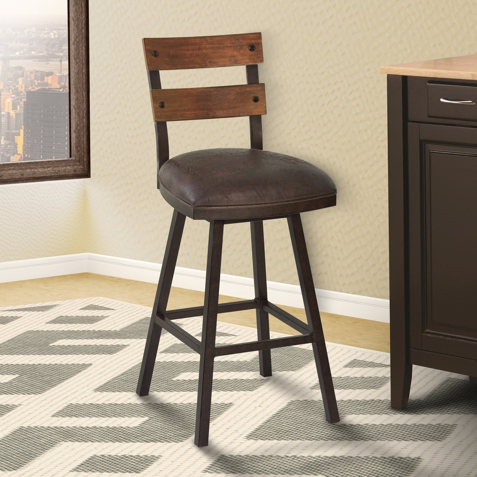 The Armen Living Saugus Transitional Swivel Barstool combines luxury and practicality, making it a perfect fit for any modern home. Its versatile design adapts seamlessly to a range of dining room and kitchen setups. Available in two elegant styles—Bandero Tobacco with a Mineral finish and Bandero Espresso with an Auburn Bay finish—the Saugus features a straight walnut wood-paneled back for a timeless look. With its blend of style, versatility, and durability, this barstool is a must-have. The Saugus comes in both 26-inch counter height and 30-inch bar height options.
