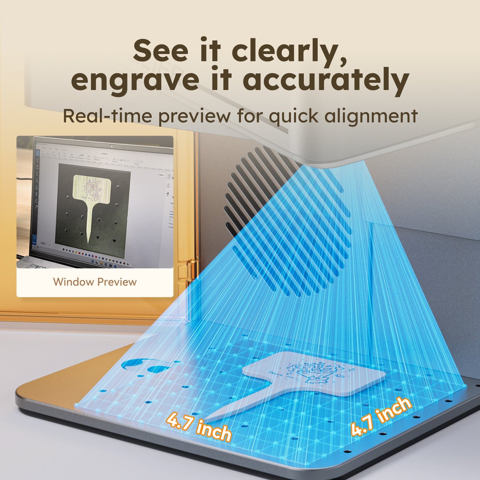 Featuring 1 mm camera alignment accuracy, you can frame your design in real time and engrave with confidence. Its ultra-fast 4,000 mm/s galvo scanning completes projects in record time, while the 12W diode laser delivers powerful performance for engraving and cutting wood, leather, coated metals, dark acrylic, fabric, and more.
