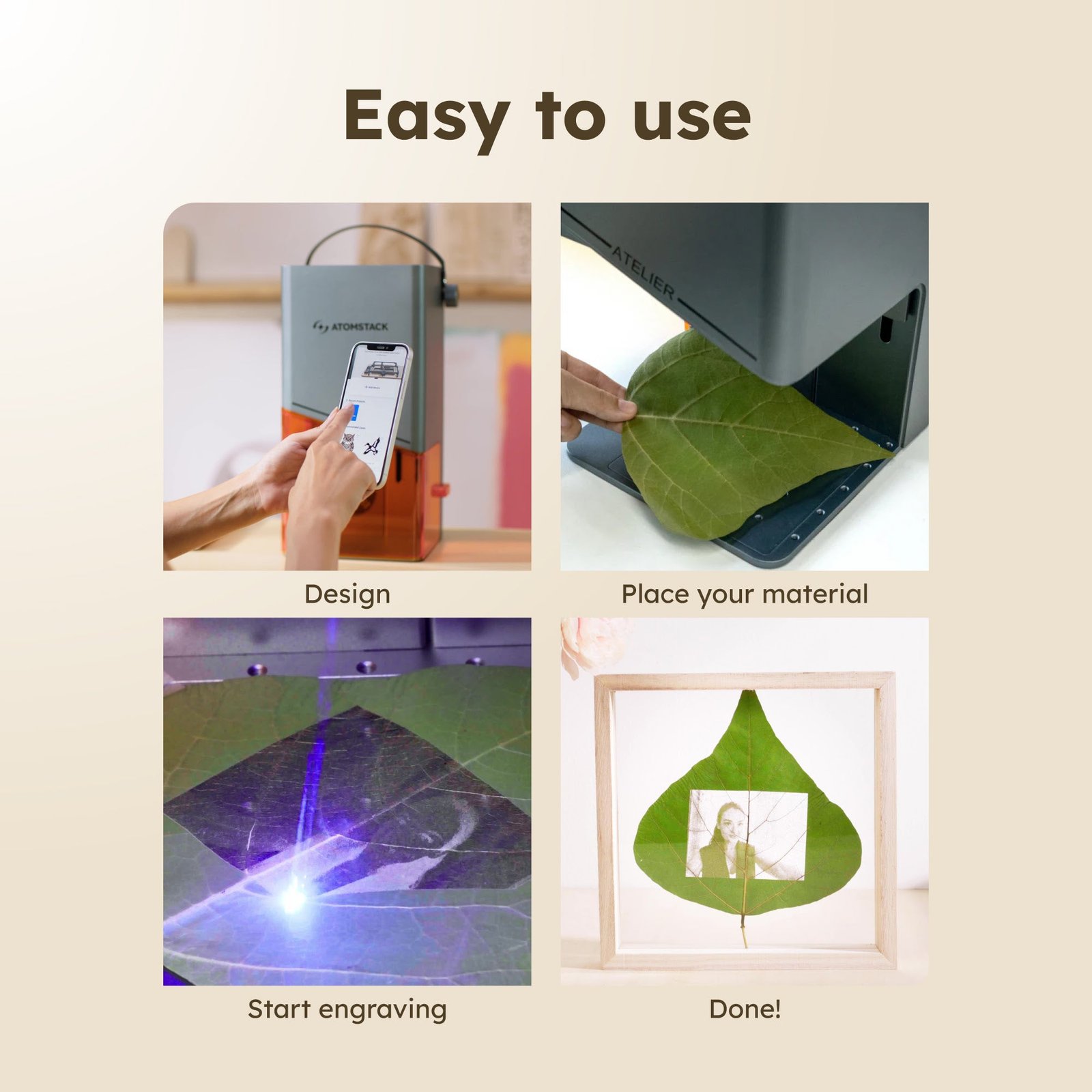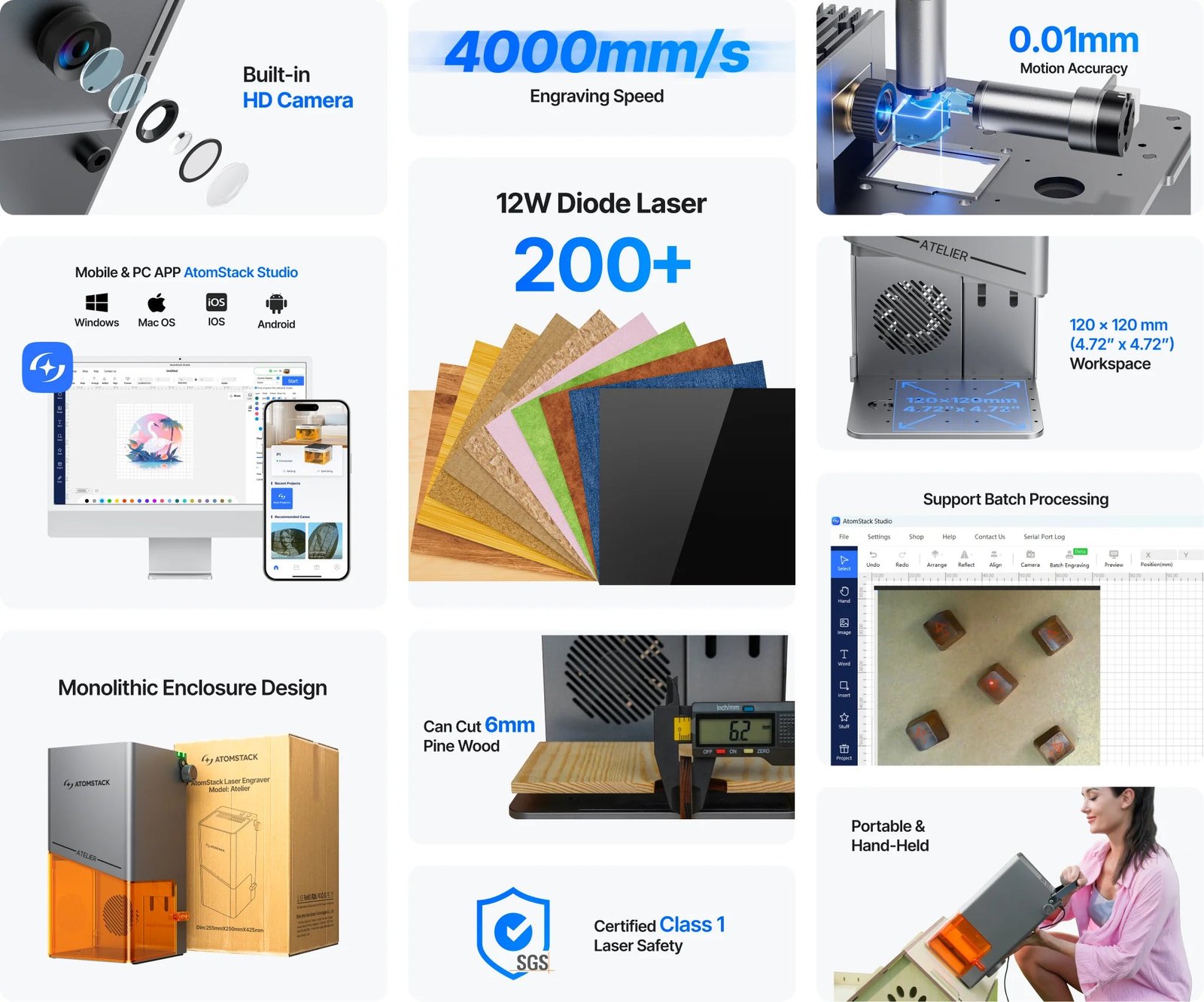 Create custom gifts, business merchandise, personalized accessories, and high-volume production runs with unmatched speed and clarity—The AtomStack Atelier is your all-in-one creative engraving solution.