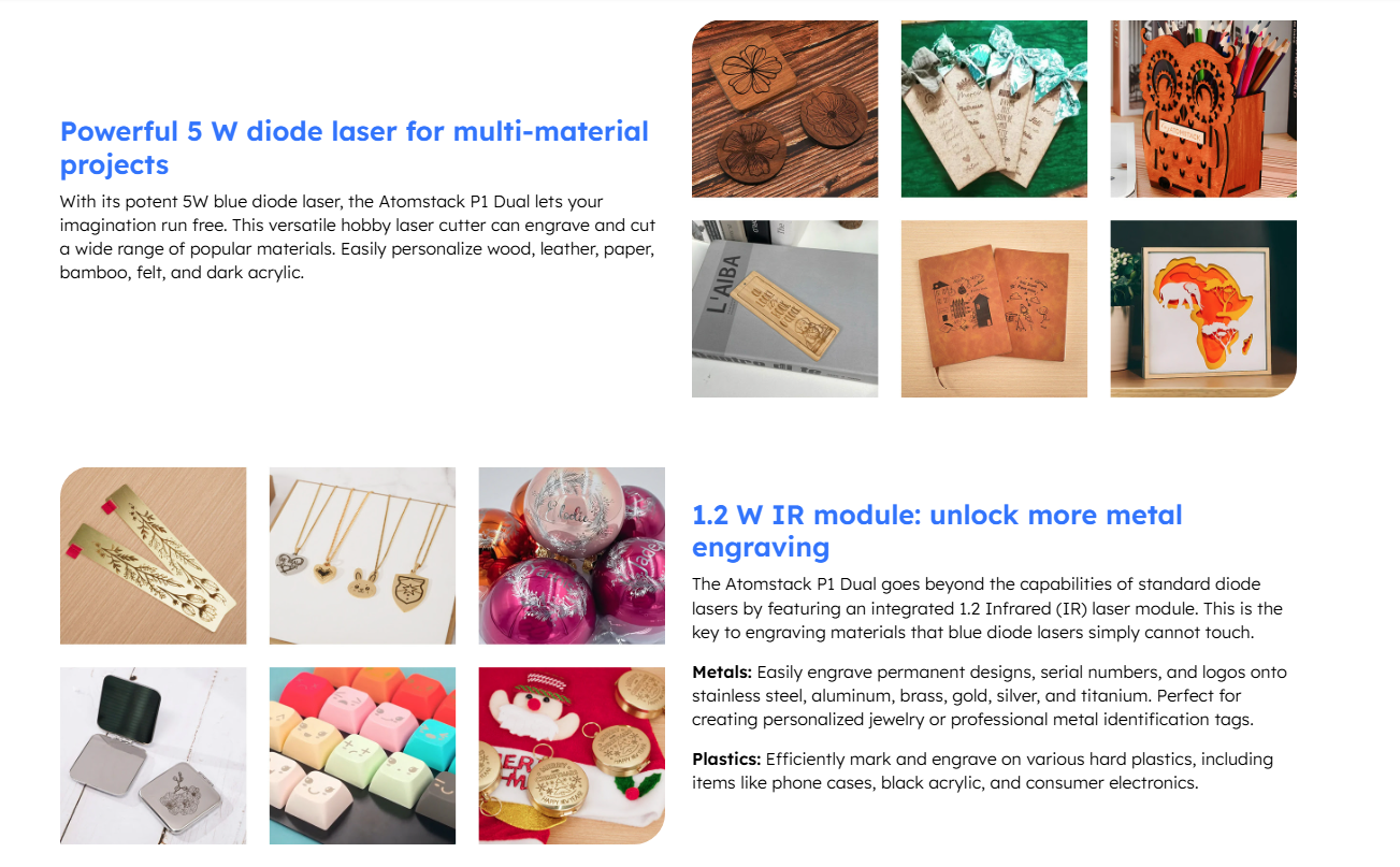 Along with its 5 W diode module, the AtomStack P1 Dual Laser Engraver also includes a 1.2 W infrared module for metal engraving. Stainless steel, aluminum, brass, iron, gold, silver, platinum, titanium, black acrylic, plastic, etc.