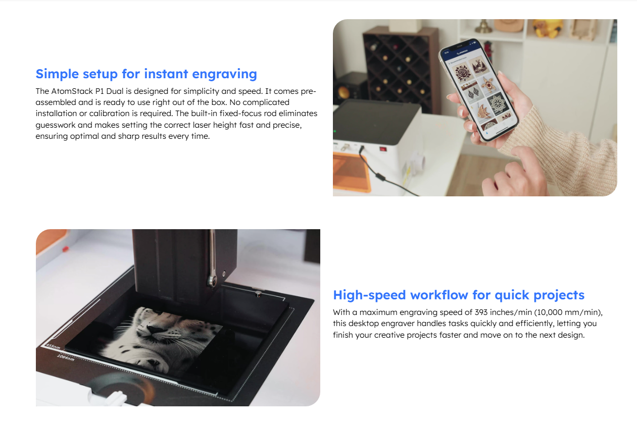 Starting with laser engraving can be daunting. This is why AtomStack has developed the P1 Laser Engraver. This machine comes fully pre-assembled. Get started within 15 minutes after unboxing the P1. Perfect for people who want to give laser engraving a try.Â