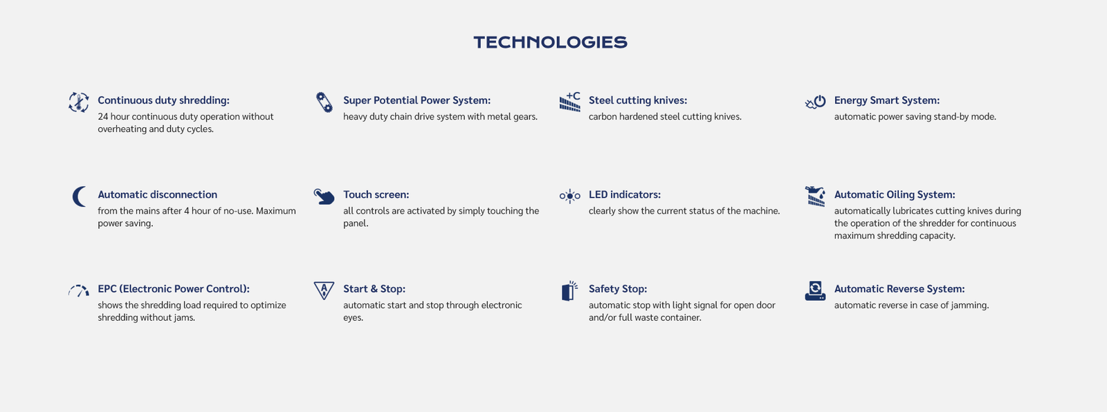 Professional high security touch screen shredder suitable to shred “Classified” and “Top Secret” documents: all controls are activated by simply touching the panel. Motor thermal protection: 24 hour continuous duty motor without overheating and duty cycle, carbon hardened steel cutting knives. Kobra 270 TS HS-6 AO can shred a paper sheet in about 20.000 0,8 x 5 mm mm (P-7) micro-chips which become absolutely unreadable even if special electronic devices are used. The 0,8 x 5 mm mm cut size exceeds the NSA/CSS Spec. 02-01 National Security Agency requirements. It can shred transparent material too. Heavy duty chain drive with steel gears which offer reliability and resistance to wear.