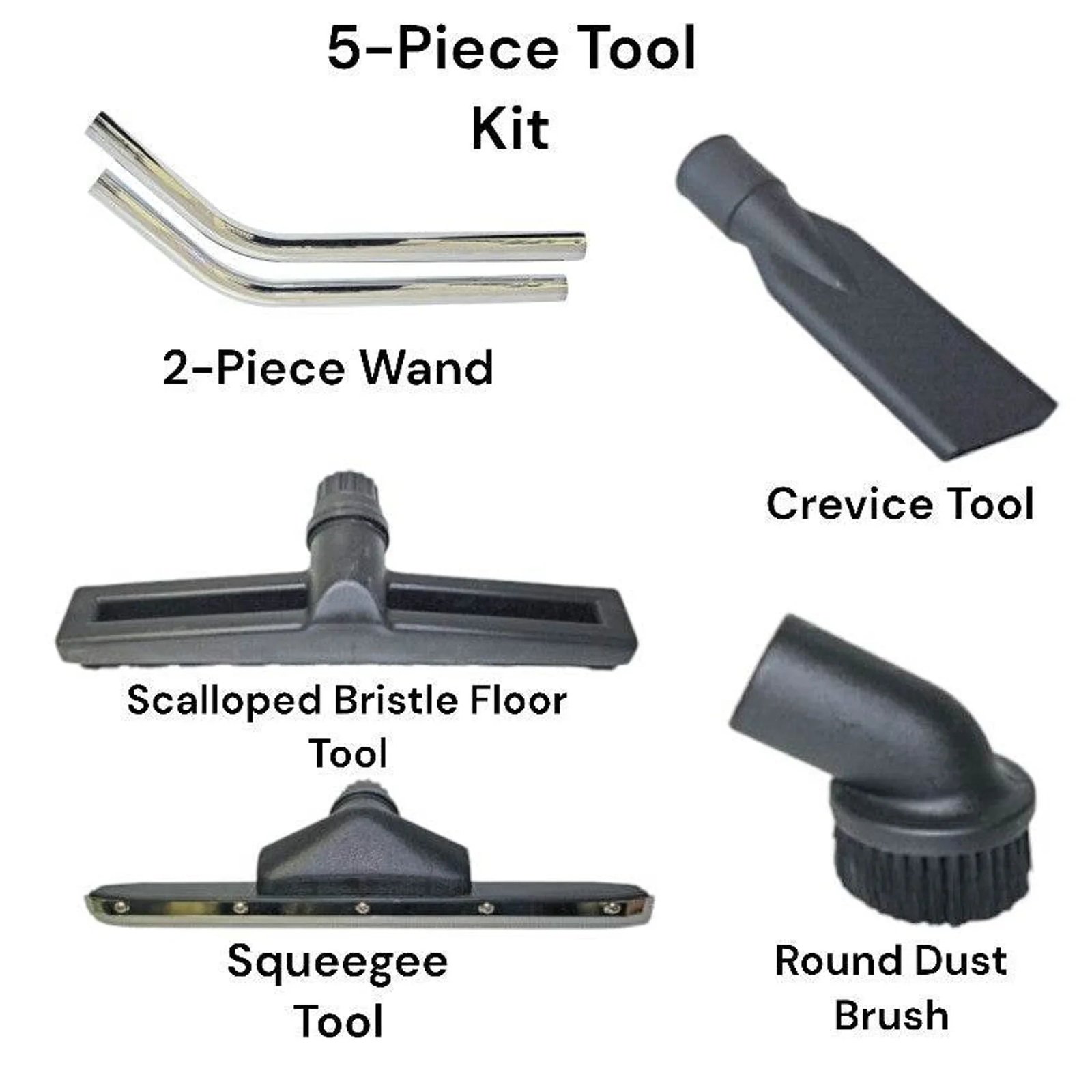- 5-piece tool kit included: Crevice tool, dust brush, squeegee tool, scalloped bristle floor tool, 2-piece wand