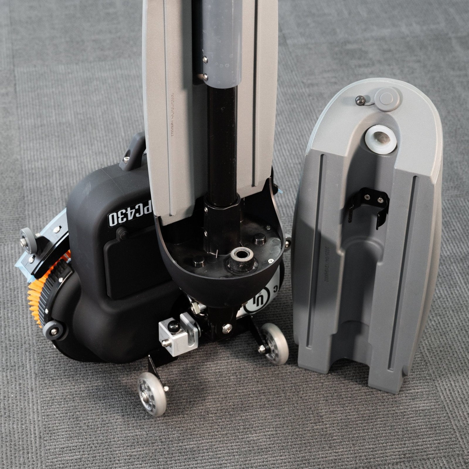 The Procare SPC430 Mini Floor Scrubber delivers powerful and compact cleaning performance with a 17.5-inch (450 mm) cleaning width and 800–1,000 m²/h (8,611–10,764 ft²/h) productivity. Designed for tight and hard-to-reach spaces, it features double counter-rotating brushes, a 3.2 L (0.85 gal) clean water tank, and a 6.5 L (1.7 gal) dirty water tank for extended operation. Powered by 2nd Generation 12V, 12Ah lithium battery, it offers 1.5 hours of runtime with a quick 3-hour full charge, making it ideal for frequent daily cleaning in confined areas.