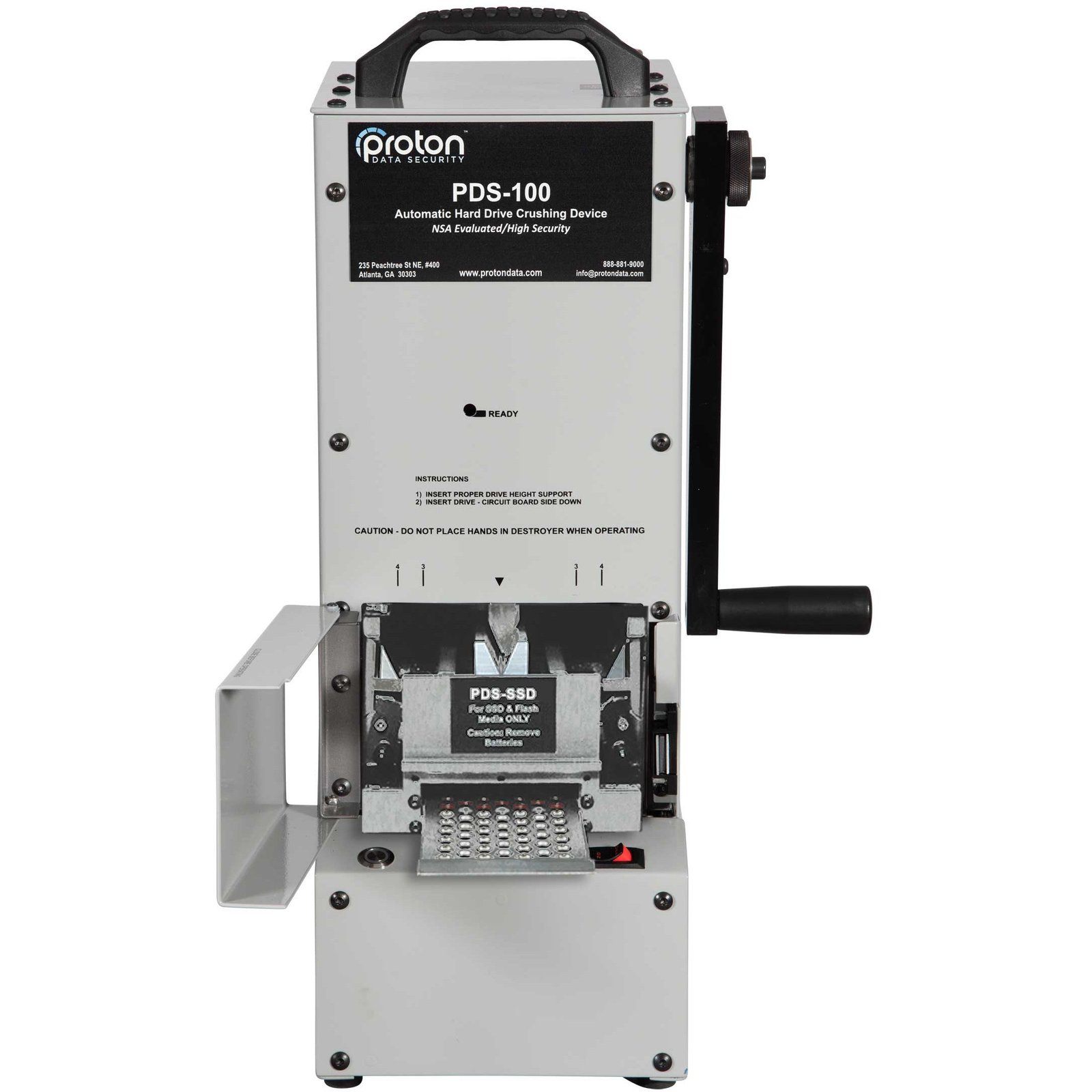 - Simple operation: Insert PDS-SSD into your Proton destroyer (PDS-75 or PDS-100) then place media inside drawer and close. Operate destroyer normally – blade will lower through insert and press down on internal plate, pushing numerous spikes through the media. Blade will then return to starting position automatically. Open drawer to remove punctured/perforated media