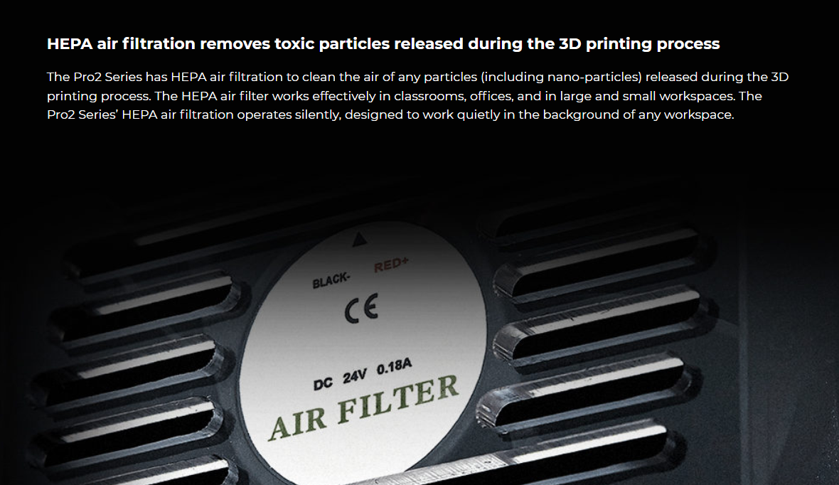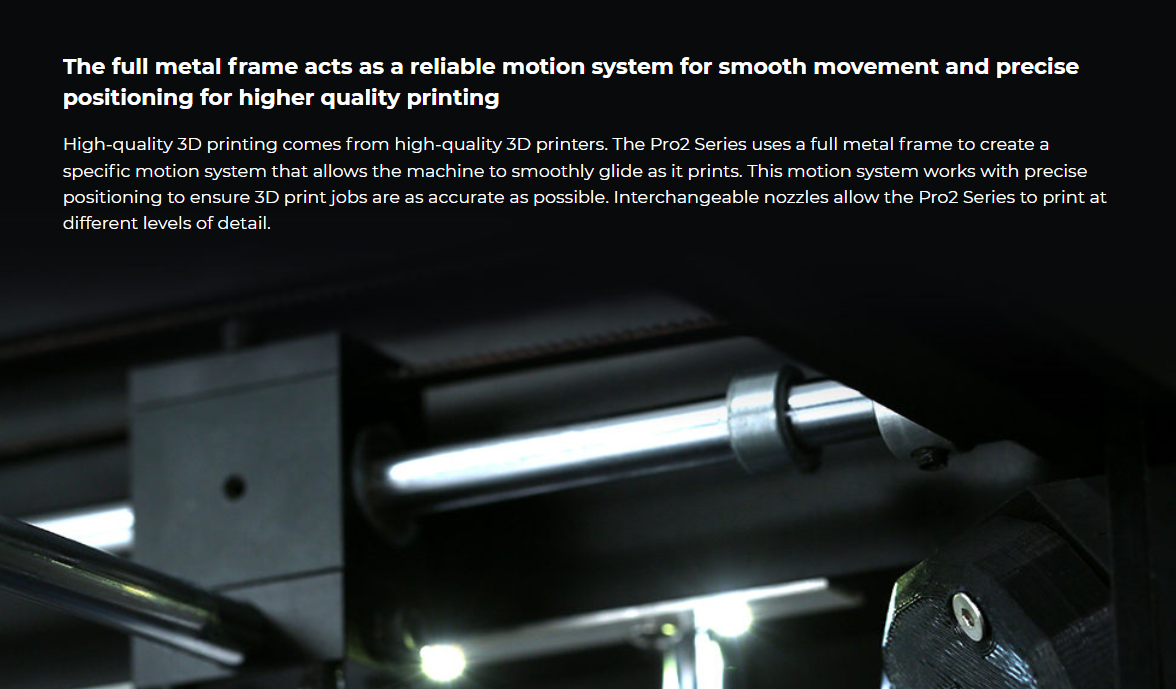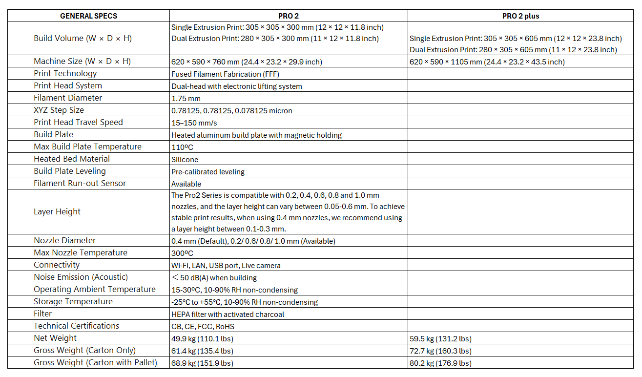 The Pro2 dual extruder 3D printer can print up to 12 x 12 x 11.8 inch | 305 x 305 x 300 mm. The Pro2 Plus 3D printer can print up to 12 x 12 x 23.8 inch | 305 x 305 x 605 mm.