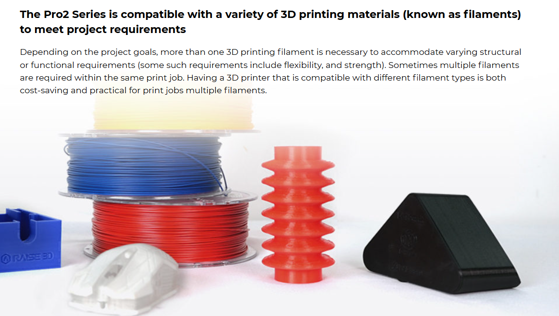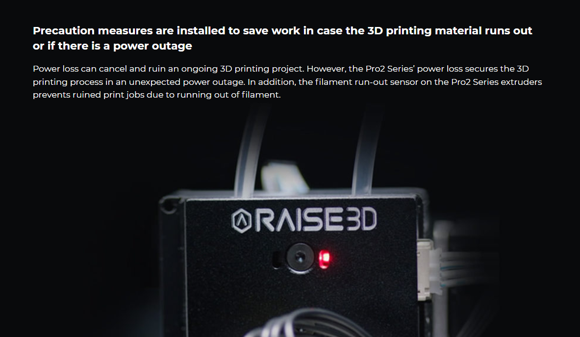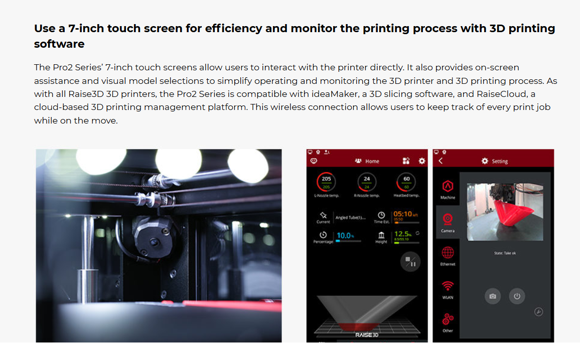 The Pro2 Series has a metal build plate for even heat distribution, along with a full metal frame for smooth movement and precise positioning, and is compatible with a variety of 3D printing materials. The Pro2 Series is complete with precaution measures to save work, a 7-inch touch screen for efficient monitoring of the 3D printing process, and a HEPA air filter. As with all 3D printers from Raise3D, the Pro2 Series can pair with: ideaMaker, a 3D slicer software, ideaMaker Library, a platform for sharing 3D printer files with those in the Raise3D community, and RaiseCloud, a cloud-based 3D printing management platform. Finally, as with all Raise3D products, the Pro2 Series is both ISO 9001 and ISO 14001 certified.
