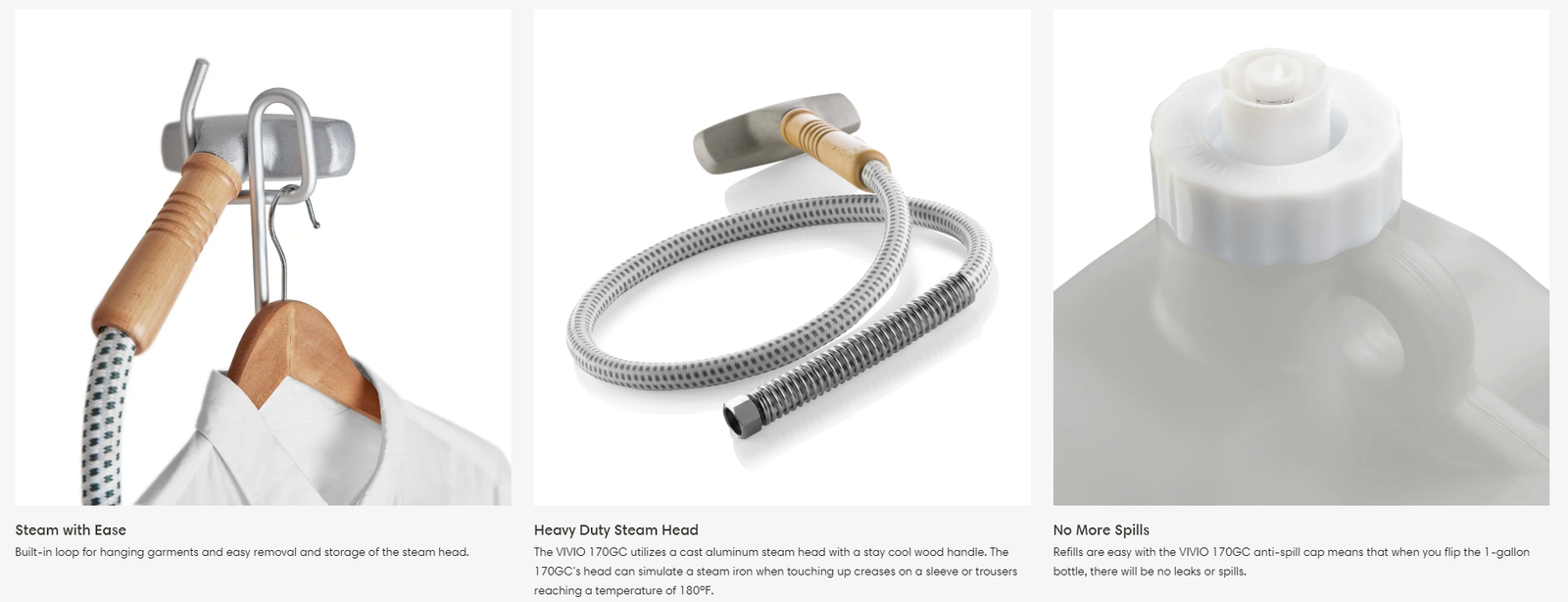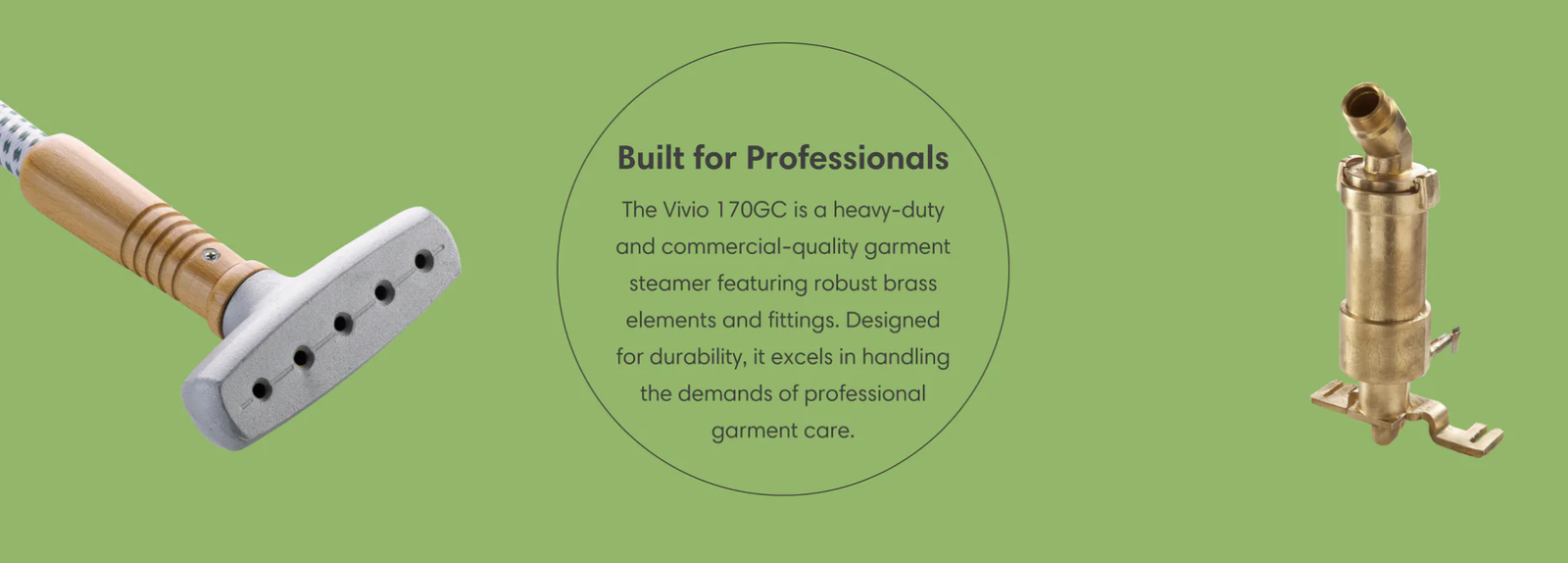 For over 20 years, Vivio has been the name that clothing retailers have trusted. A professional steamer is only as good as its components. To prevent mineral build-up, the most important part is the heating element and for this, we exclusively use our 1300W brass heating element. For safety, we include a wrap-a-round housing that prevents the bottle from falling off. The Vivio 170GC uses a metalhead that gets 20% hotter than a PVC head for taking care of tough wrinkles or to act as an iron.