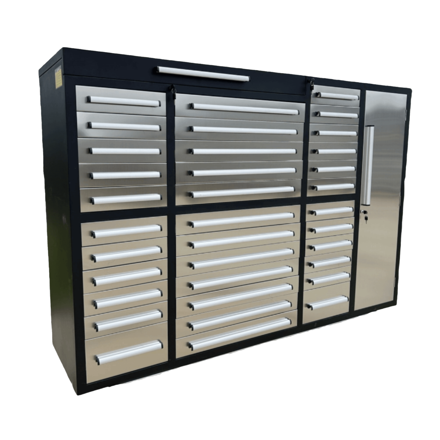 The 7ft Storage Cabinet is ideal for organizing and protecting your tools and equipment. Featuring 35 drawers and one large cabinet, it provides ample space for sorting items of different sizes, keeping your workspace organized and efficient. The drawers slide smoothly on full-extension ball-bearing slides and include anti-slip mats for secure storage. Built with a durable steel body and a robust stainless steel tabletop, this cabinet is designed to withstand heavy use for years.