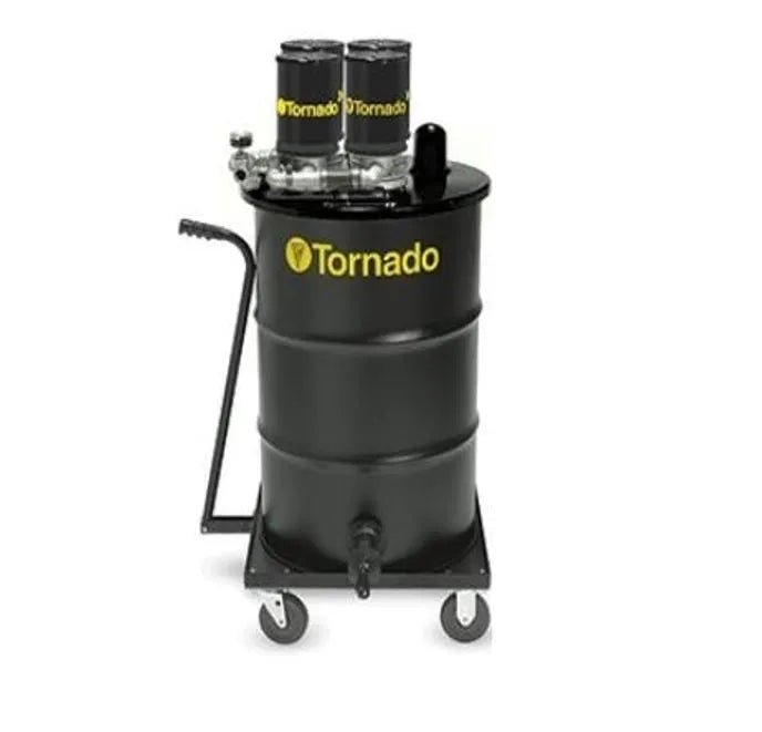 Powered by compressed air, Tornado’s internal filtered Wet Jumbo Air Vacuum creates exceptional waterlift substantially beyond your typical vacuum. These machines have been developed specifically to cover industrial rapid high-volume recovery environments. Our air Jumbo’s work exceedingly well handling the following maintenance challenges: Heavy oil, machine oil, printer’s and other inks, sludge and most all other industrial wet pick up problems. Patented venturi powerheads are fitted on a rolled top 55-gallon drum, all of which sits on a heavy-duty four-wheel steel dolly for easy transport. Order in either dual head or quad head configurations. Specific air line and air compressor HP requirements apply as detailed on our product brochure.