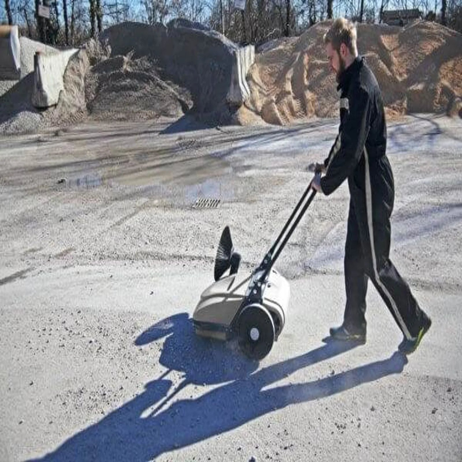Battery-powered sweepers provide higher suction force at consistent levels regardless of operator speed. The DFS29’s gear-driven fan produces suction proportional to walking speed—slower pushes produce less airflow. This makes the DFS29 most effective at a steady walking pace on flat surfaces where fine dust needs containment. On heavy debris—gravel, large particles, liquid spills—battery-powered machines provide better performance. The DFS29 advantage is zero operating cost, no charging schedule, and operation in locations where battery equipment is restricted or impractical.