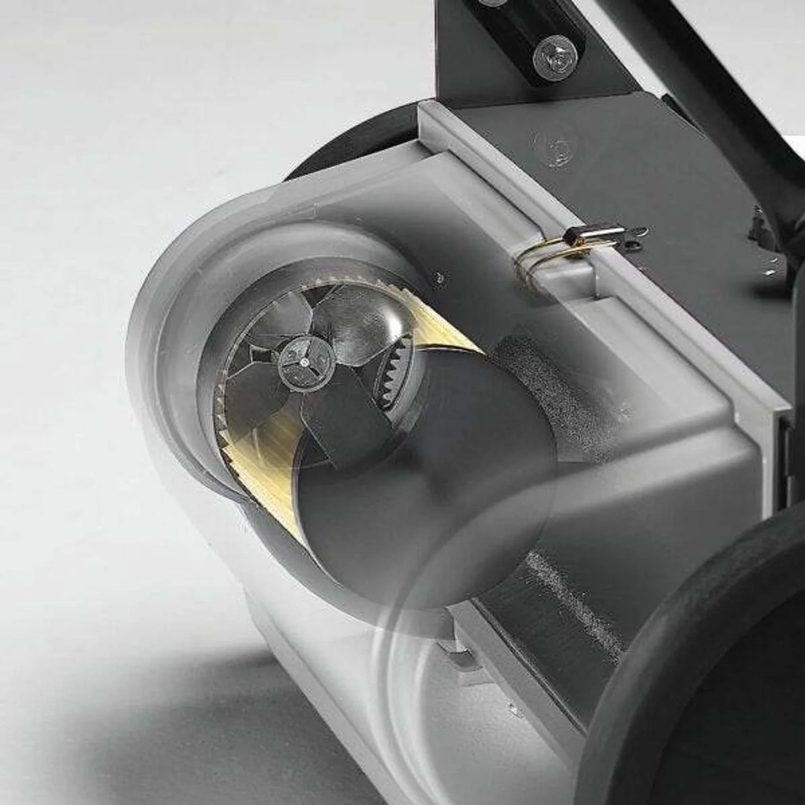 - Gear-driven fan system — wheel rotation powers the internal fan through a mechanical gear train; suction strength scales with operator walking speed.