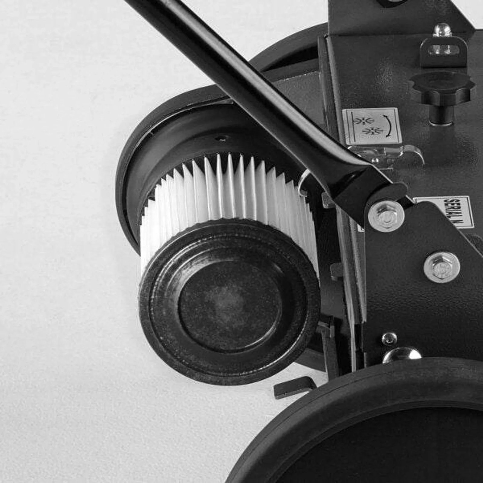 - Sealed vacuum chamber — contains the airflow path between the brush and the collection hopper; prevents fine dust from escaping the brush zone during sweeping.