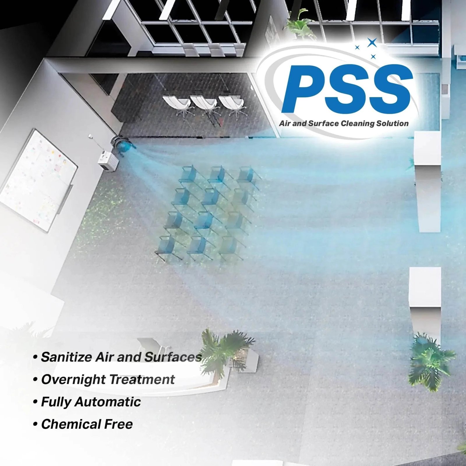 Medical and dental offices use the PSS2 to maintain pathogen control between patient appointments without manual intervention. Hospitality venues — hotels, spas, and gyms — deploy it during overnight closures to neutralize smoke, mildew, and body odors from high-traffic zones. Food-service facilities rely on the ozone cycle to address grease volatiles and organic contaminants on surfaces. Childcare centers and educational facilities benefit from the HEPA stage running continuously during daytime hours for particulate control. Warehouses and industrial spaces use both stages simultaneously to manage dust and chemical vapor buildup.