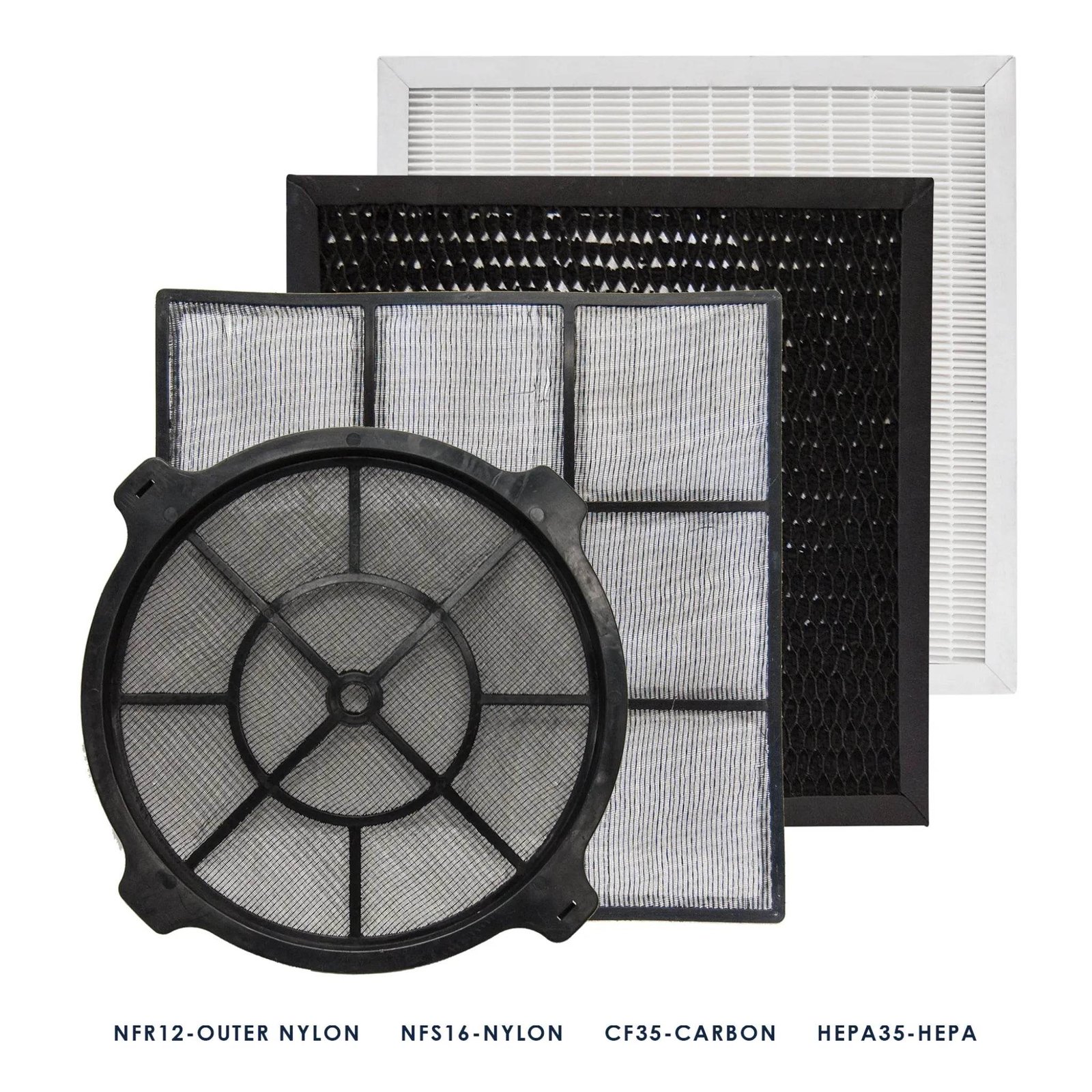 - Filtration: 4-stage — NFR12 outer ring mesh, NFS16 inner mesh, CF35 1.4″ carbon, HEPA35 1.4″ HEPA (99.97% @ 0.3 µm)